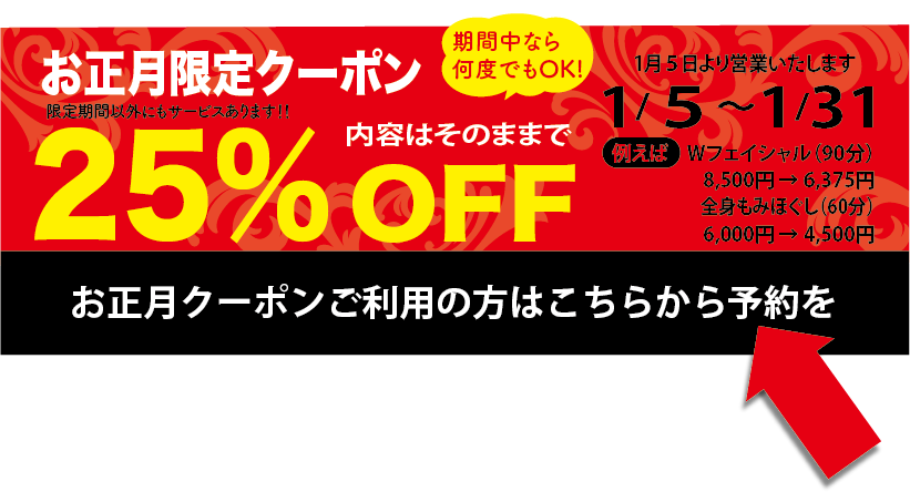 あけましておめでとうございます 01/01/2026 最終更新日時 : 12/19/2025 curare-01 あけまして おめでとうございます!本年もよろしくお願い申し上げます これからも富里のご近所の皆さまに気軽にご利用いただける様精進してまいります マッサージやエステ要素の素肌ケアをお得にご利用いただけるお正月キャンペーンがございます!ぜひ、この機会にご利用くださいませ